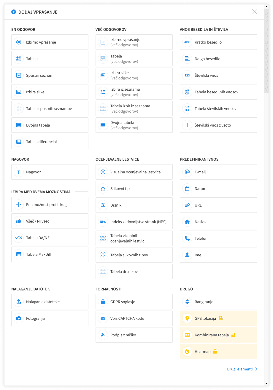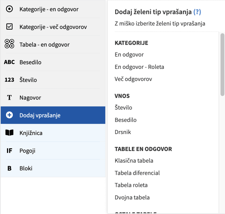 The UI changes addressed the interaction-level problems: icons for every type, hover-state previews with descriptions, a three-column layout to reduce scrolling, a close button, a section header, and a visually separate section for non-question elements like Calculation and Quota. Several question types also got new names based on the alternatives participants most consistently preferred. "Kategorije – en odgovor" became "Izbirno vprašanje (en odgovor)", "Število" became "Številski vnos", "Roleta" became "Spustni seznam".